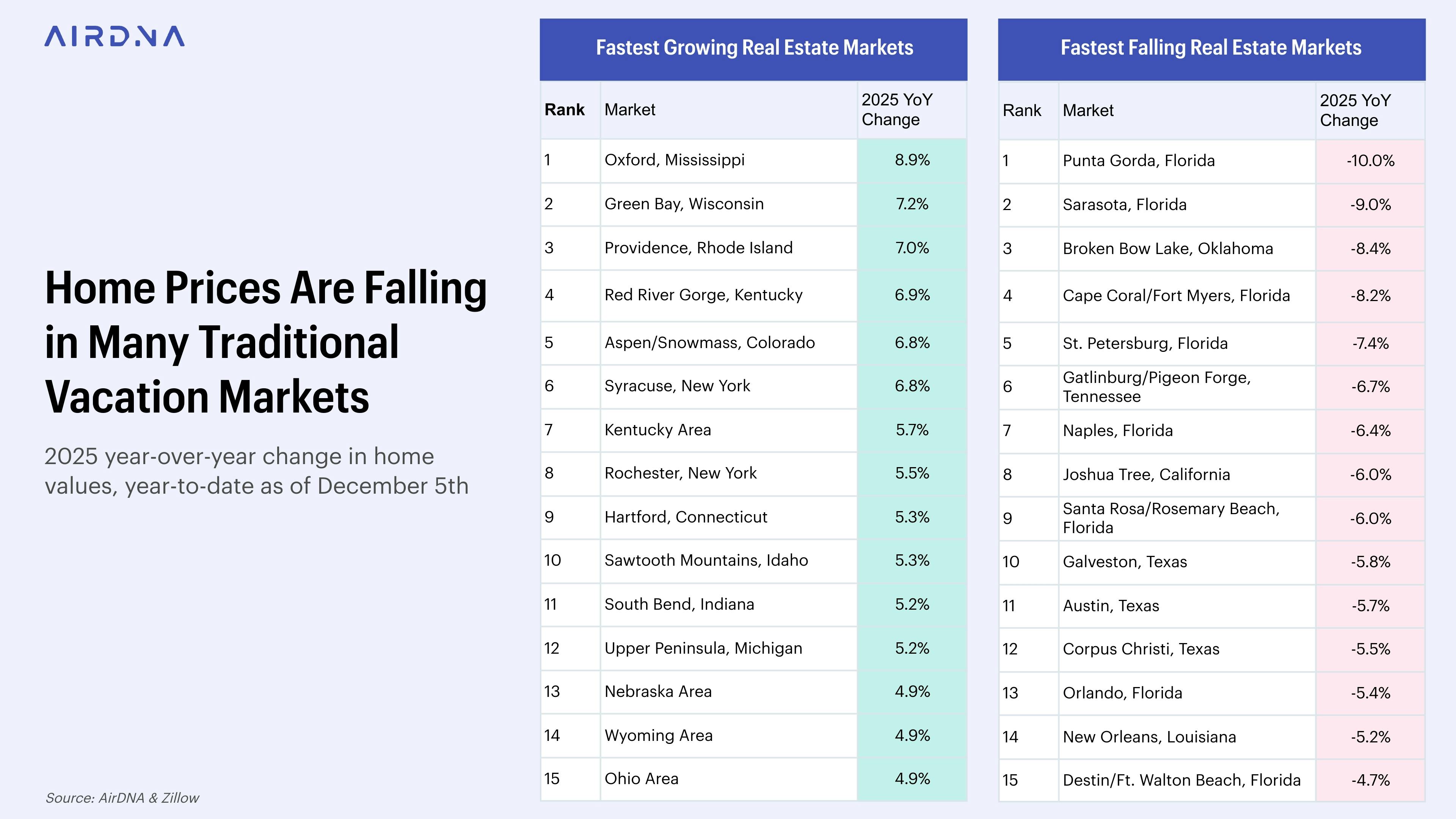 For investors, location will be just as, if not more important than, the property itself when it comes to turning a profit and seeing a return on investment. To help you pinpoint the locations to look into (and the areas to avoid), we analyzed data provided by AirDNA to find the top hidden markets expected to experience either an Airbnb collapse or boom based on findings for 2025 and the outlook report for 2026. Let’s take a closer look.